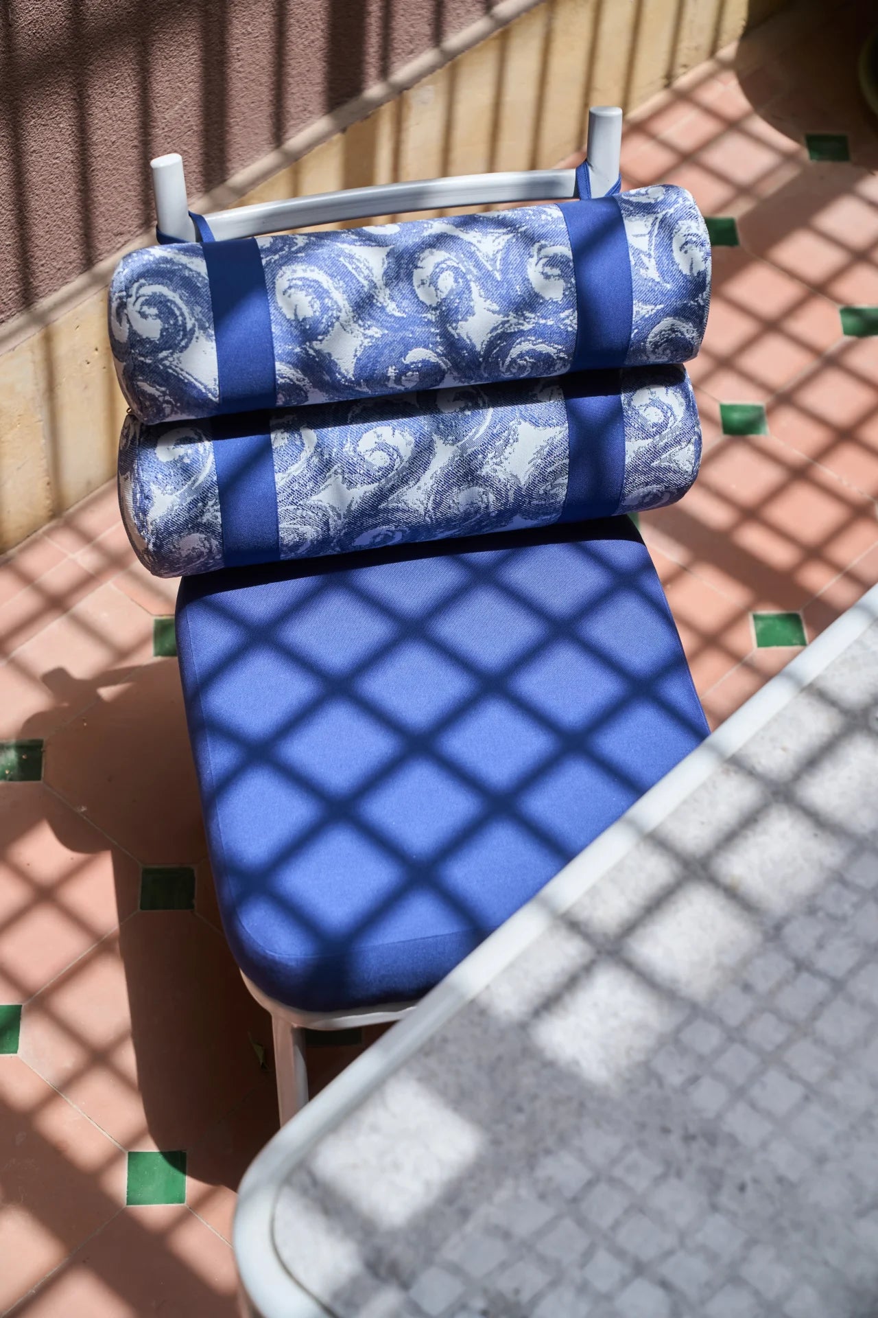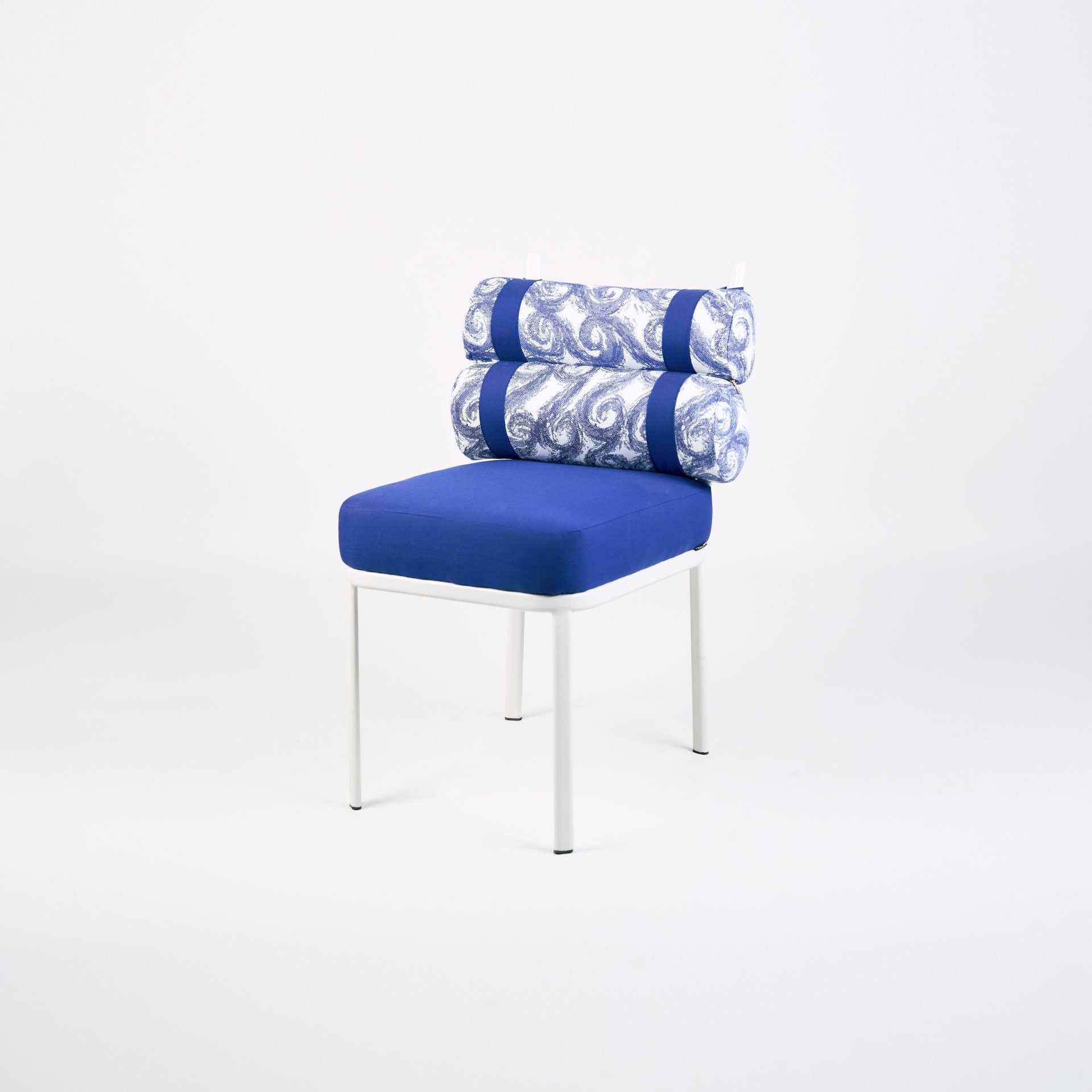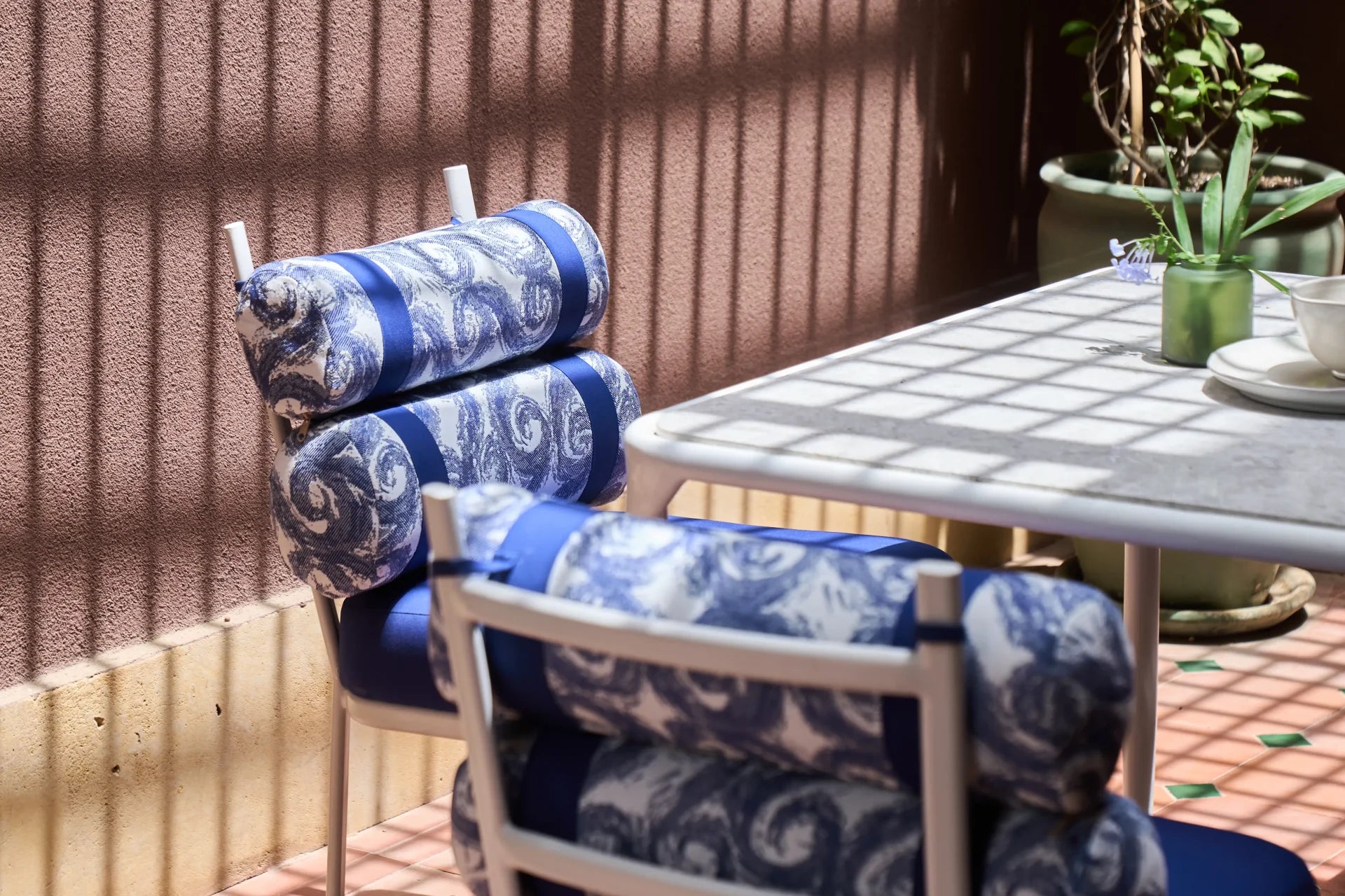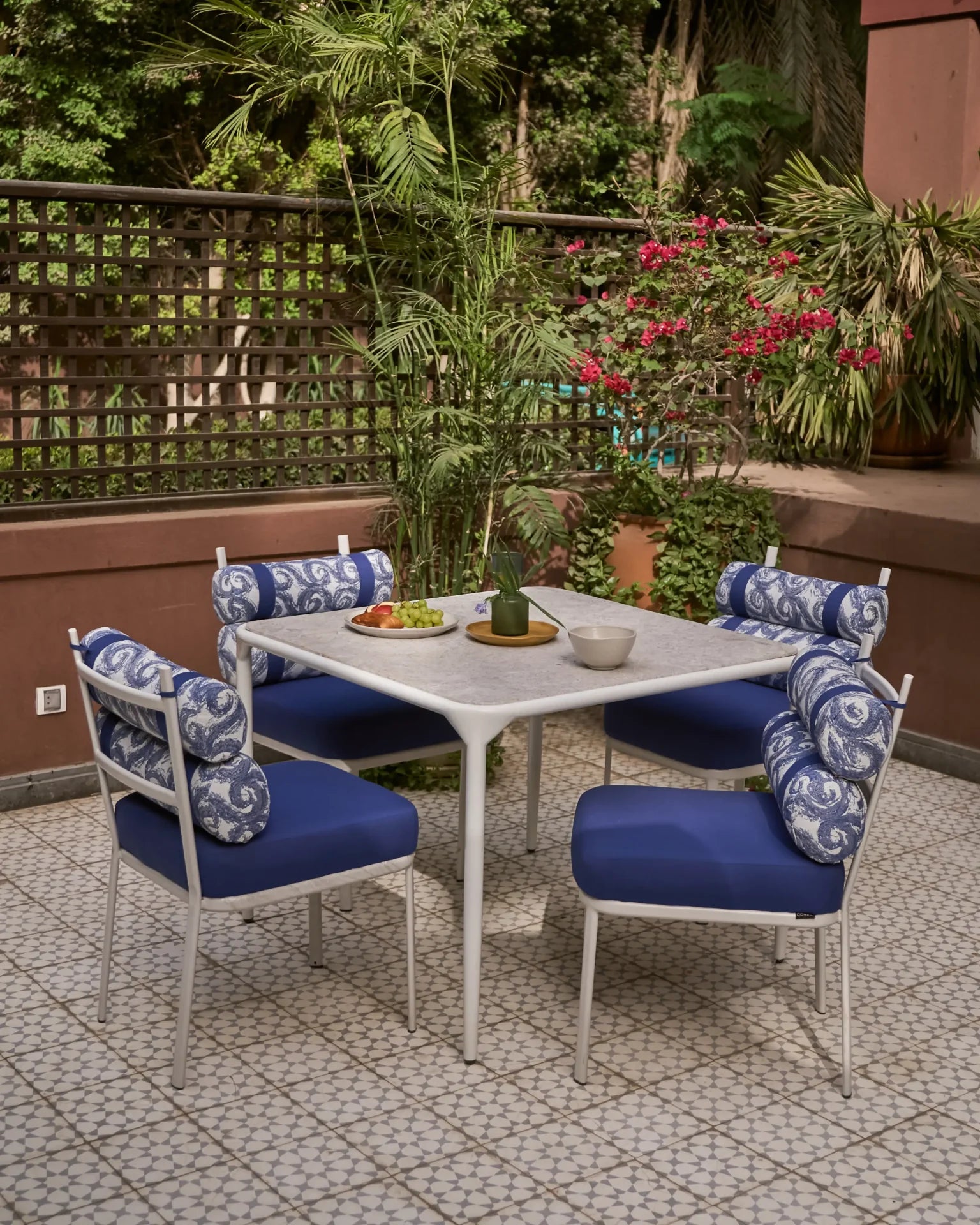 Info: Azra is a Mediterranean composition of flow and form. The dining table pairs a silver shadow marble top with an off-white aluminum frame—its silhouette crisp yet softened. The chairs echo this contrast, with sculpted aluminum frames and cushions wrapped in a wavy blue textile that mirrors the rhythm of water. Together, they create an outdoor setting defined by clarity, comfort, and coastal ease.