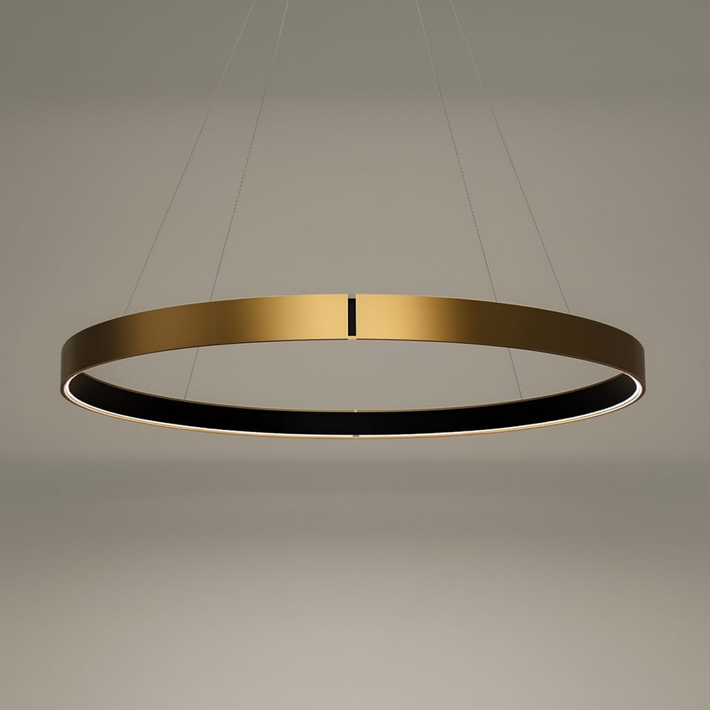 Info:Sleek and minimal, Brasso is a statement in understated luxury, Its thin, brass ring suspends effortlessly from the celling, with embedded LED lighting that casts a warm, even glow. Designed to complement dining areas, salons, and modern interiors, Brasso's refined circular form adds a sense of balance and sophistication to any space. It's the perfect blend of simplicity and elegance.