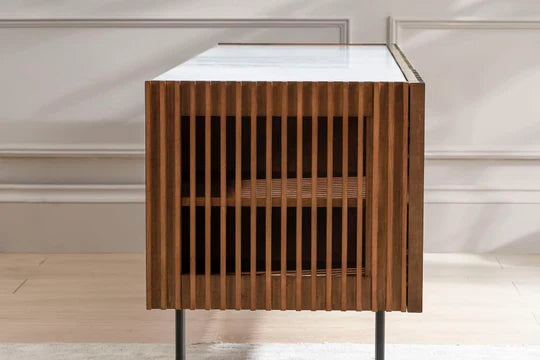 Info: Bundy is a sophisticated statement piece encased in a modern slatted façade with an Italian Carrara marble top.