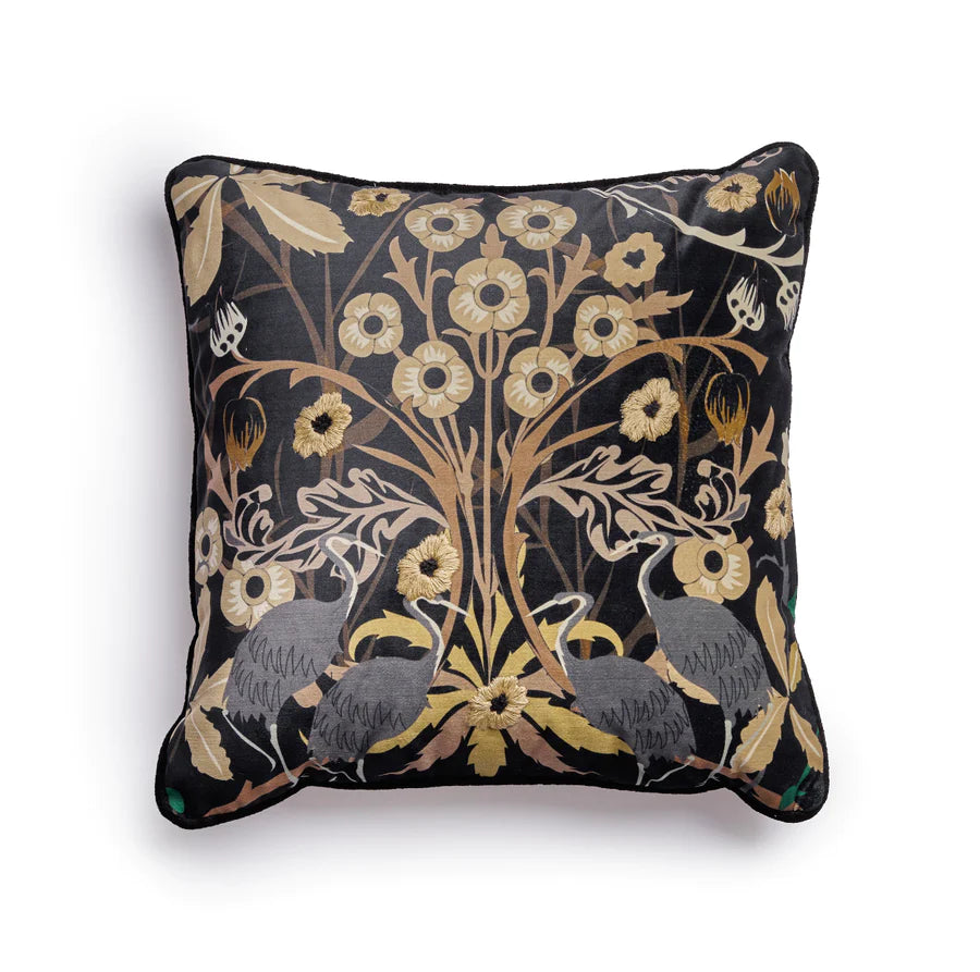 info: A rich velvet printed cushion inspired by South Africa's ostriches and wild flora life that is rich with sprinkles of embroidered flowers making it your perfect match for a fauna and flora nostalgic lifestyle.