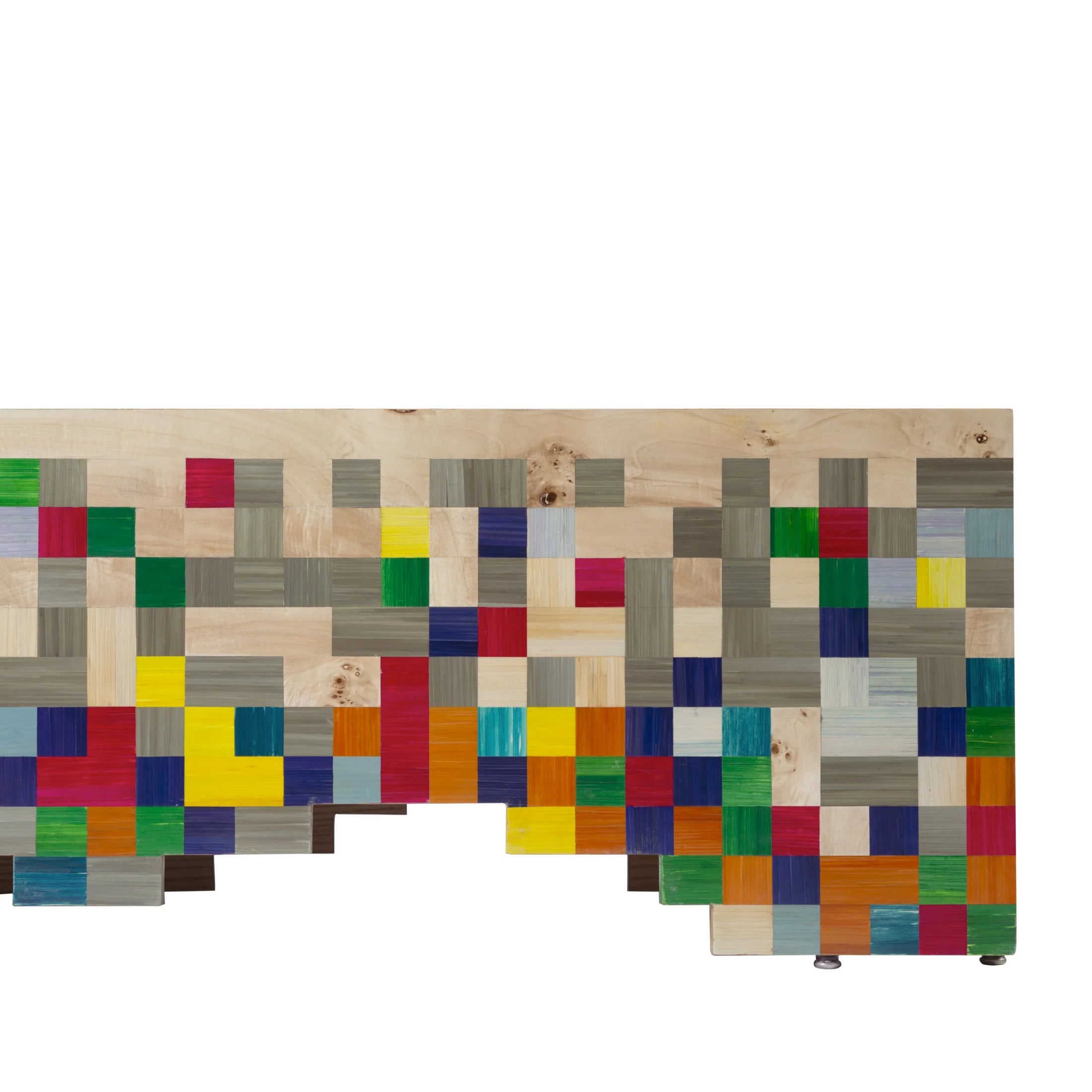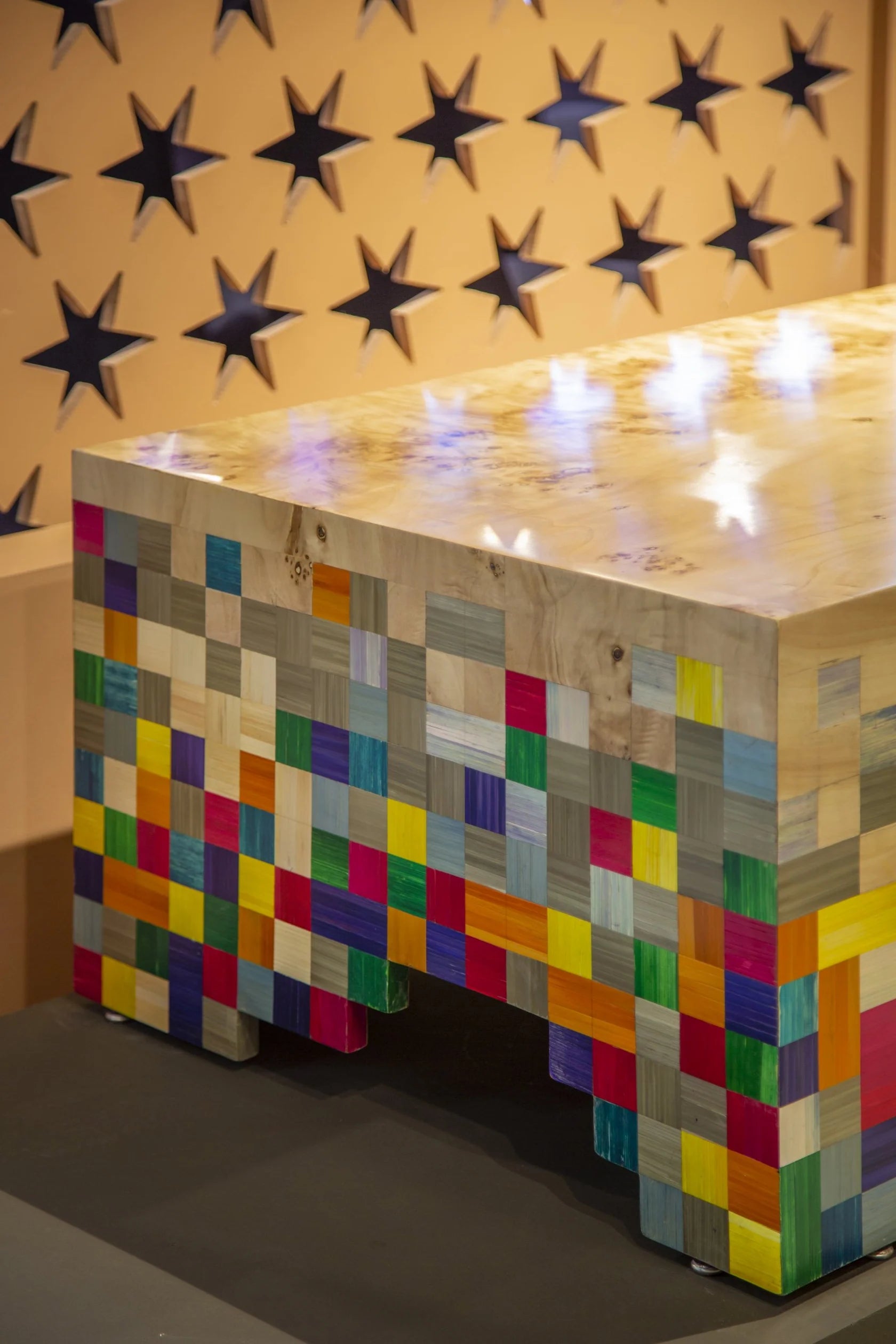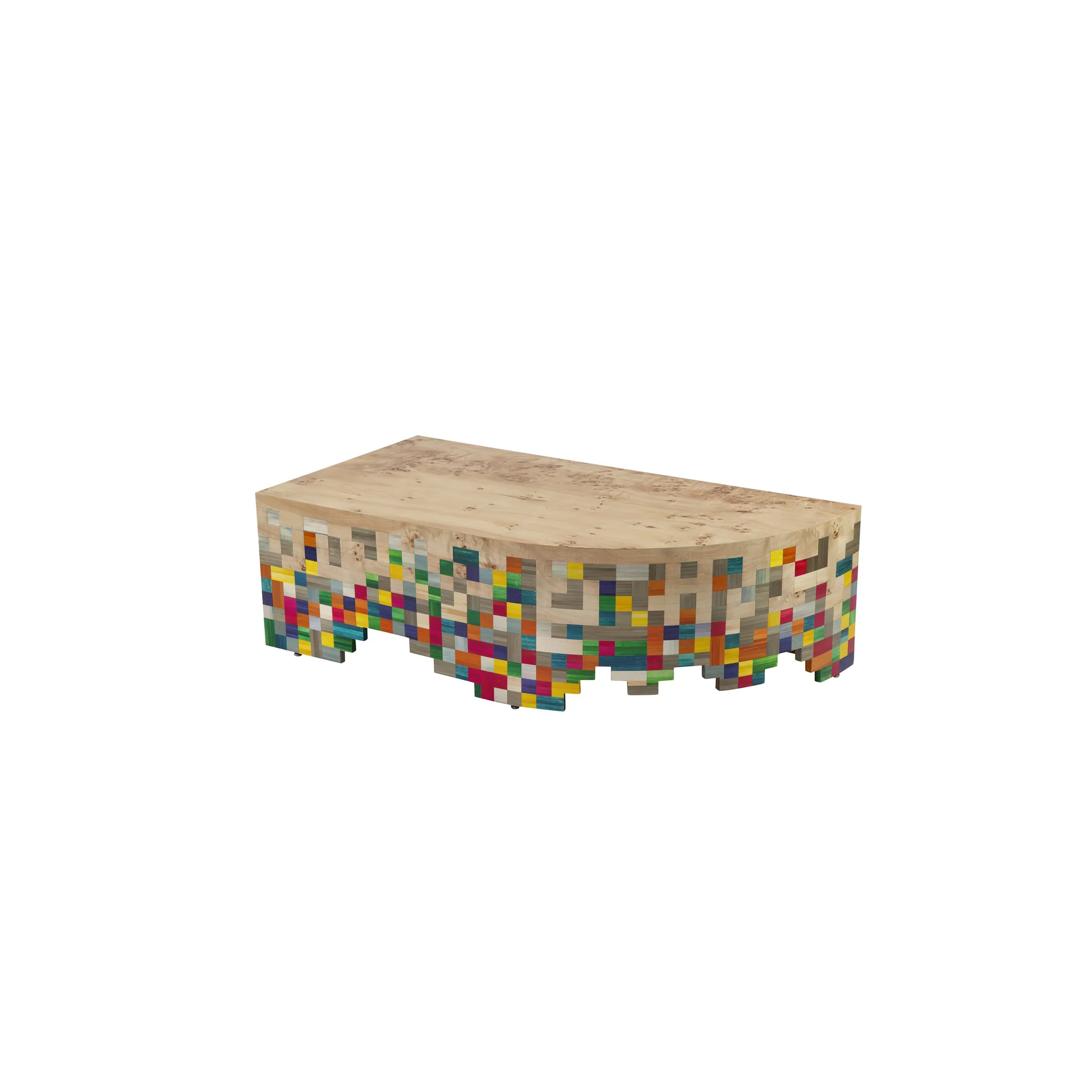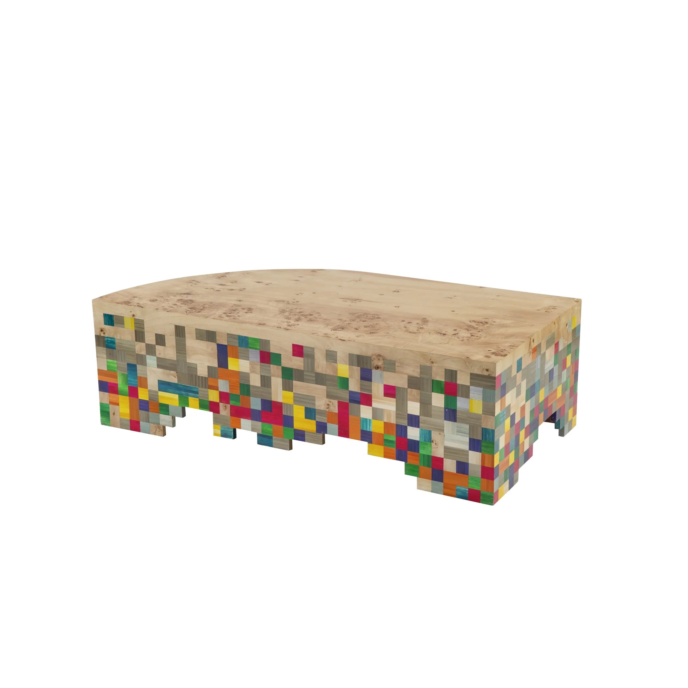 Info: This unique modern coffee table gives the impression of colorful celestial bodies in suspended animation. The uneven base gives it a sense of playfulness and liveliness, bringing the piece to life. While the single, curved corner makes it irresistible, pair two tables side-by-side for larger areas and an even more spectacular effect. The signature Shewekar-Straw tiles are hand stamped on the apple rind wooden veneer base making each one as unique as a galaxy. An indoor piece everyone will gravitate towards.