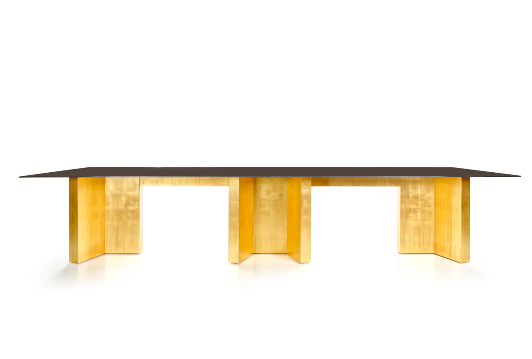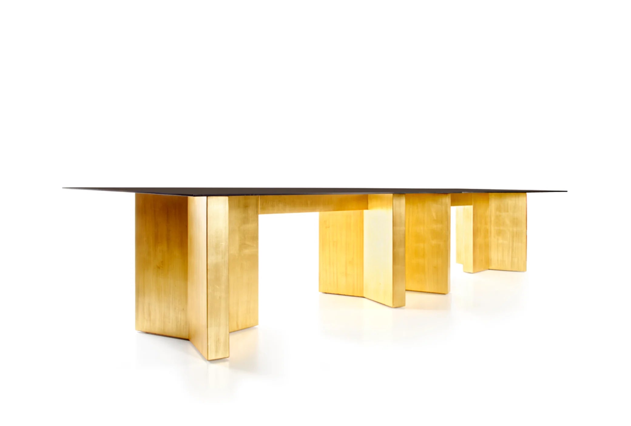 Info: This dining table always adds drama to the dining setting. The geometric base is finished in aged gold leaf, supporting a tinted glass top, which basically leaves all the focus to the base, but behind a grey filter. Quite a sophisticated design with a minimal visual and a very strong presence. When a designer gets to choose chairs and a side-board for this table it is recommended to choose objects with a neutral look, just let the table do the solo performance on its own.
