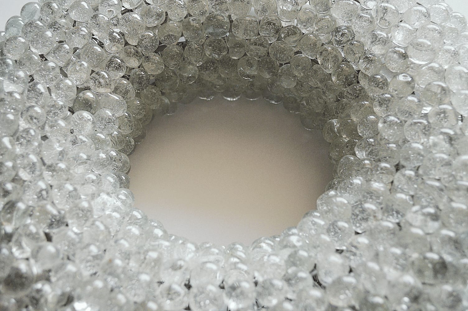 Info: The Halo is a torus-shaped, wall-mounted lighting unit that merges material innovation with meticulous handcraft. A powder-coated steel armature forms the structural core, onto which recycled glass beads are individually hand-wrapped with fine metal wire. Illumination is provided by an integrated LED strip, casting a soft circular glow that accentuates the texture and depth of the glass.