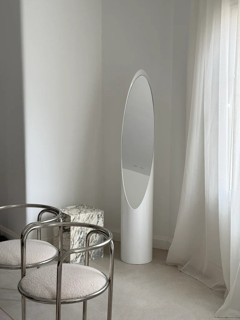 Info: A sleek, freestanding full-length mirror with a futuristic oval design, encased in a sculptural white base. This contemporary piece blends functionality with art, making it a perfect addition to minimalist or avant-garde interiors.