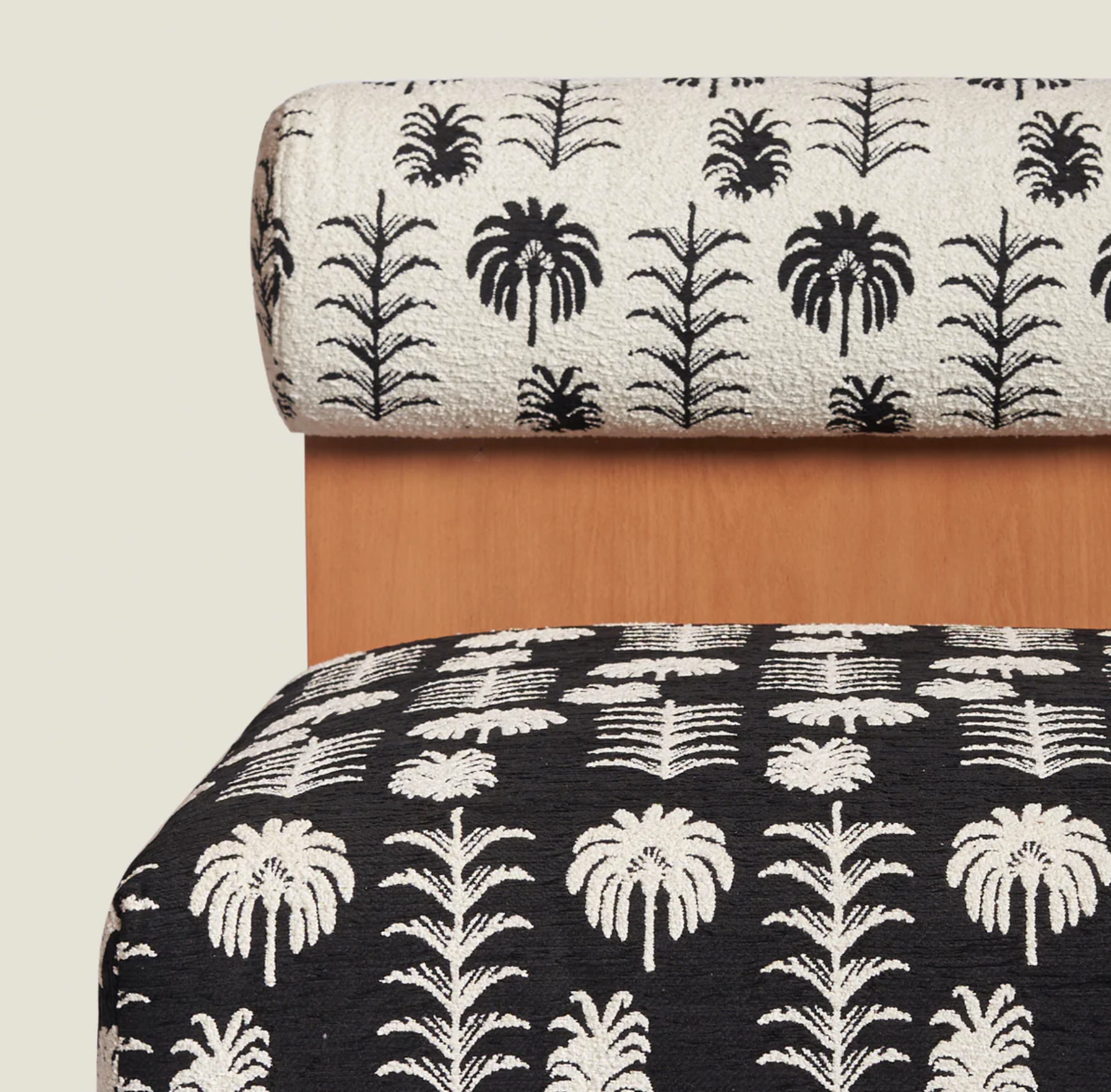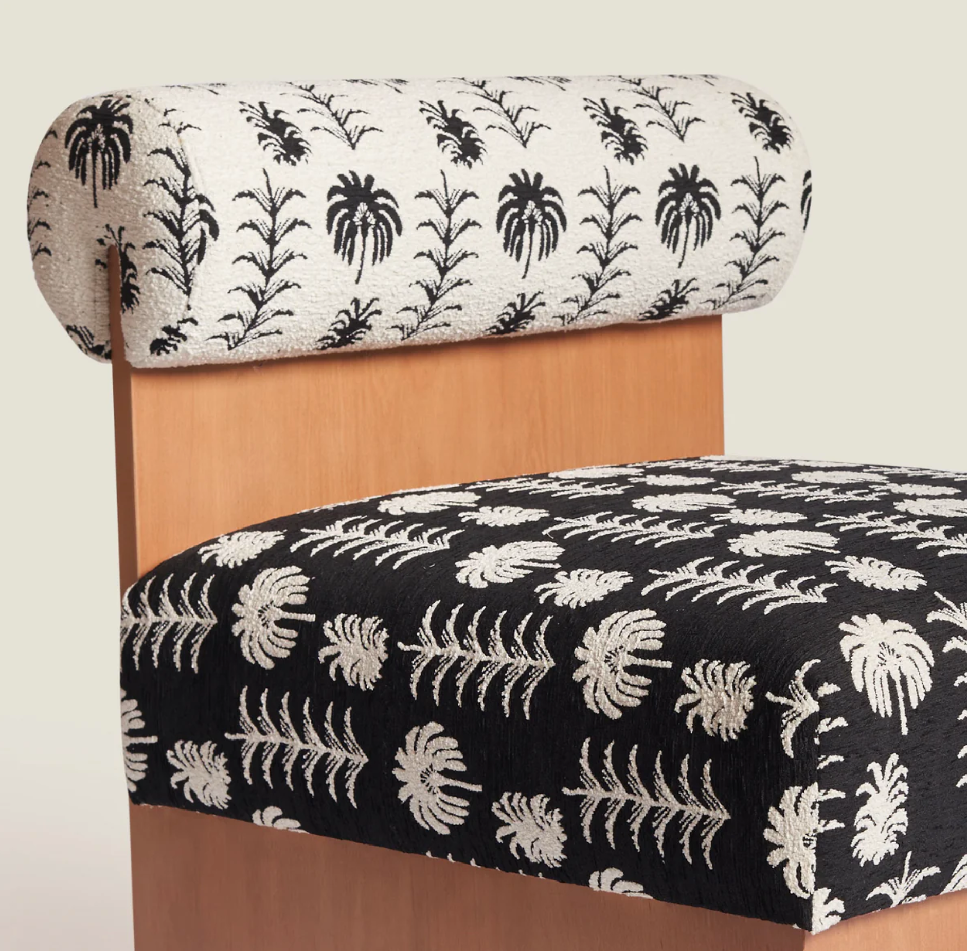 Material: Upholstered Chair with a printed boucle fabric with a Jacquard technique on a wooden base.