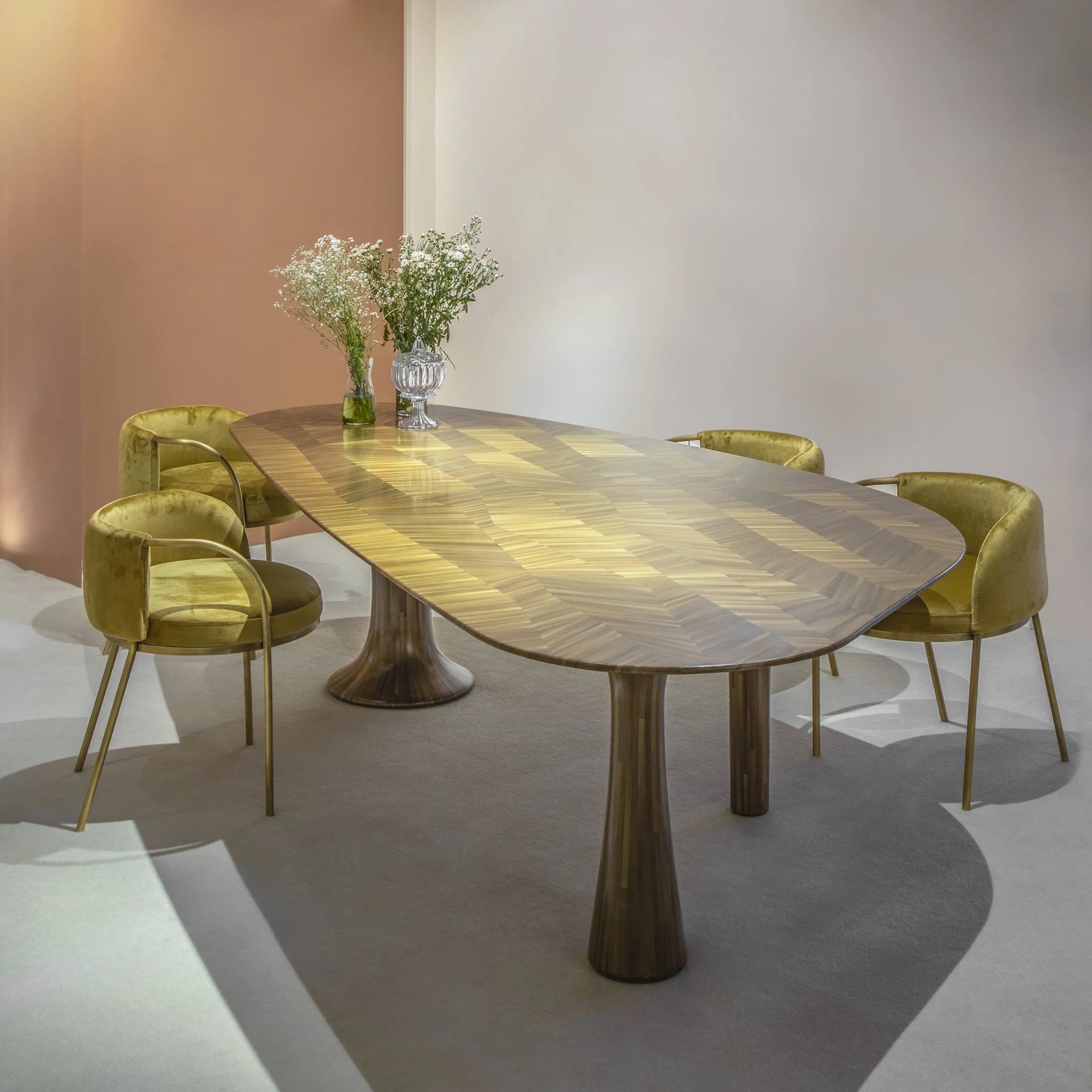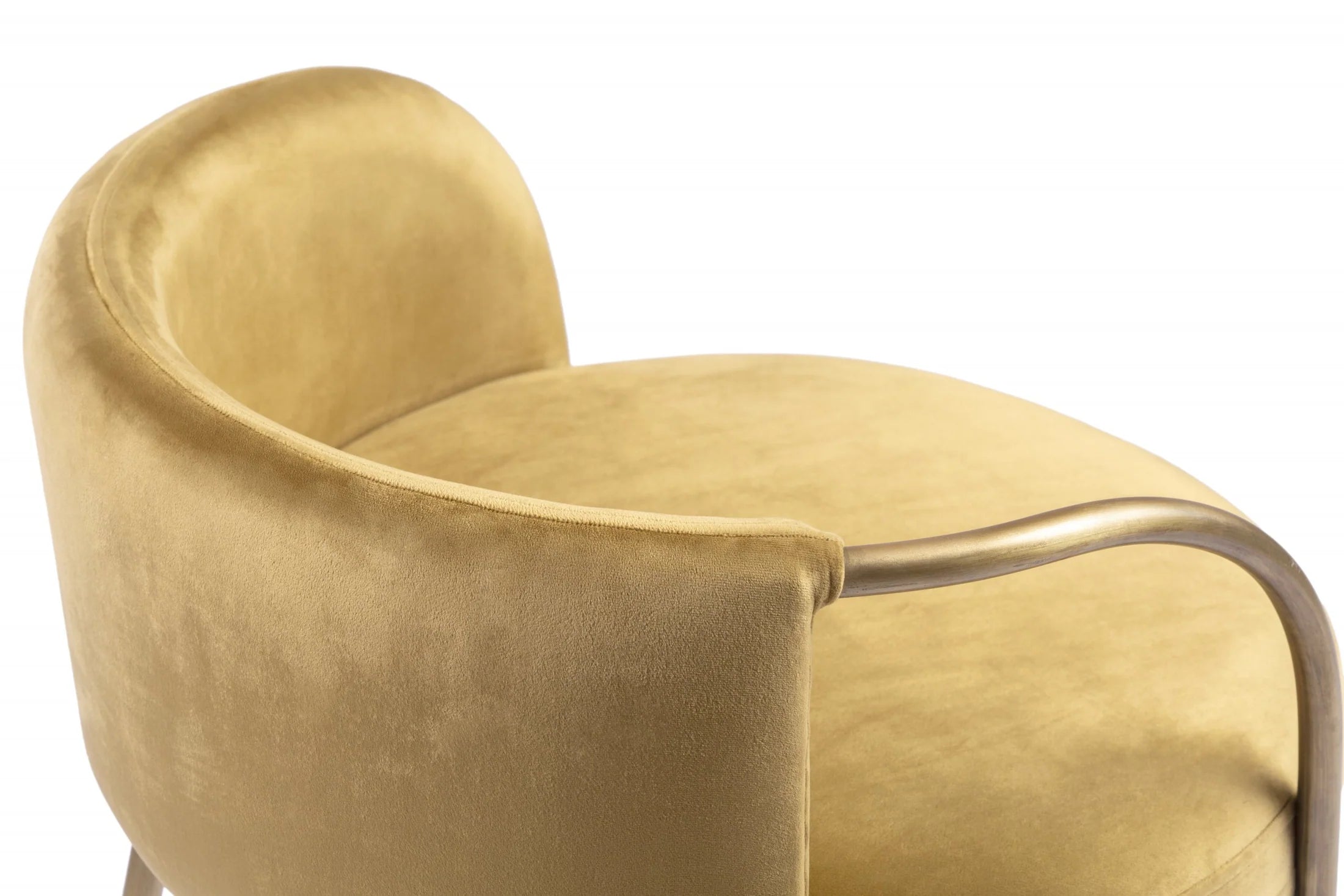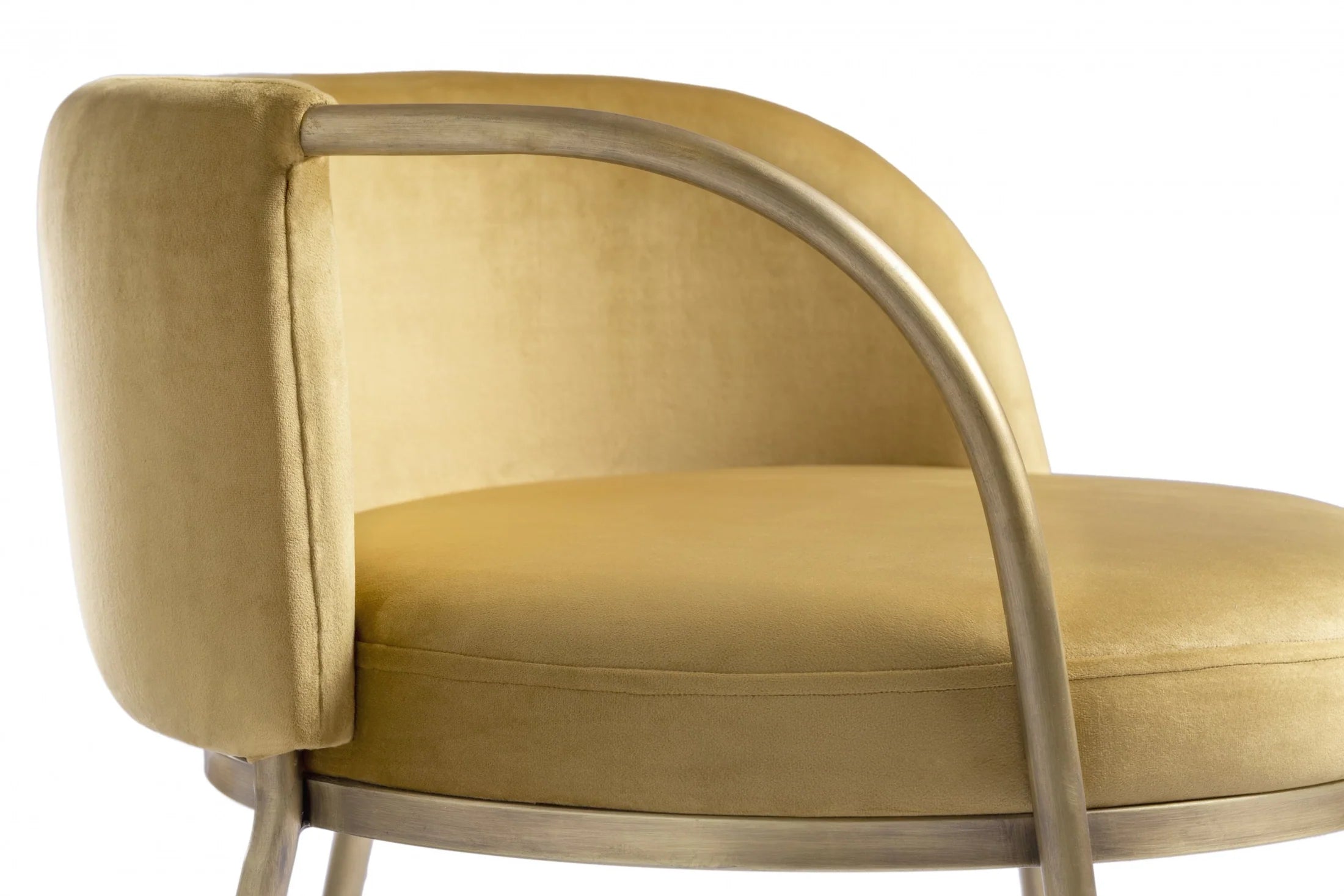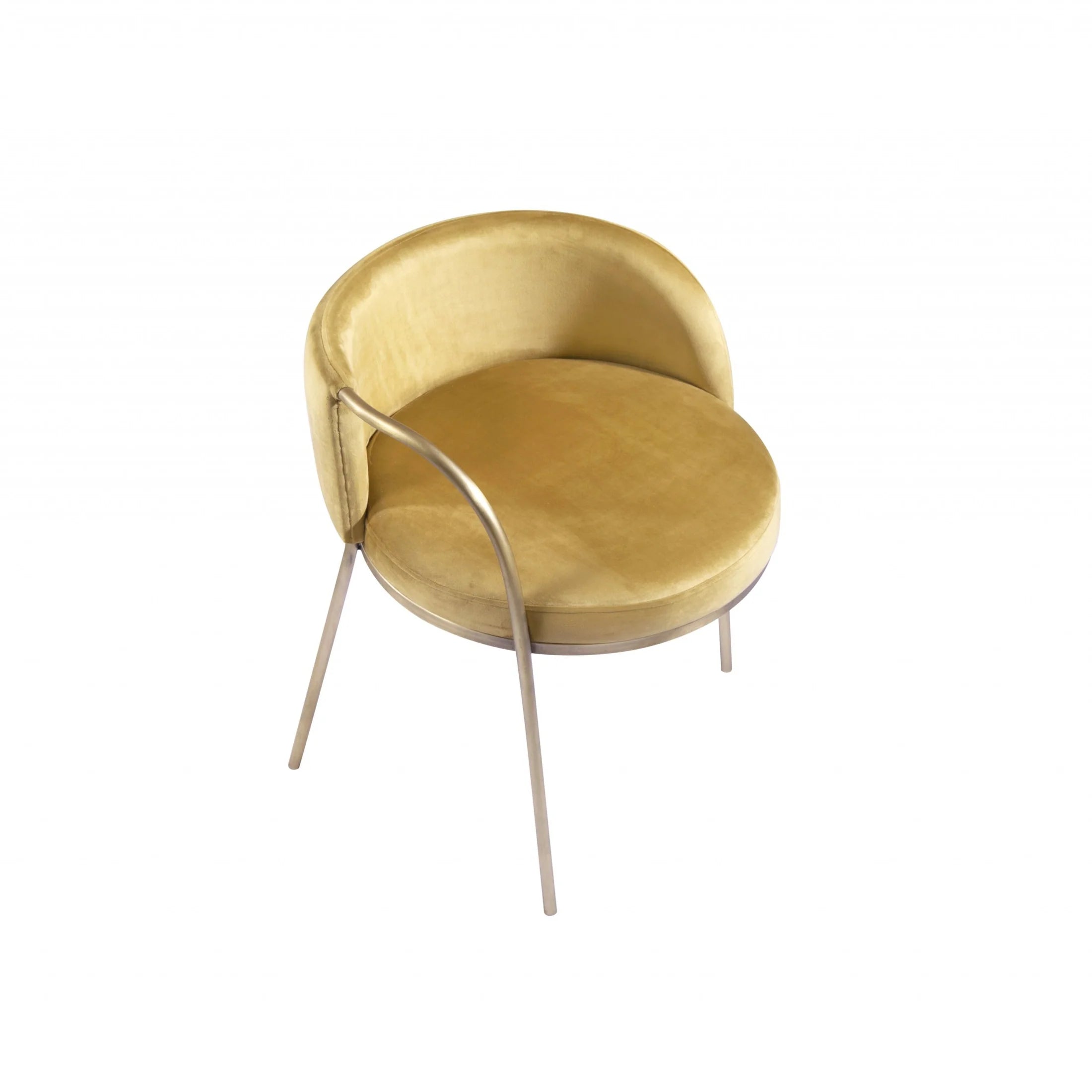 Info: These dreamy dining chairs set are inspired by waning of the moon. The brilliant one arm bare electrostatic stainless design resembles the moonrise; when the upper limb of the moon appears over the horizon. Garnished with luxurious golden velvet upholstery that radiates a warm alluring glow. Together the chair set illustrates the moon cycle from moonrise to moonset.