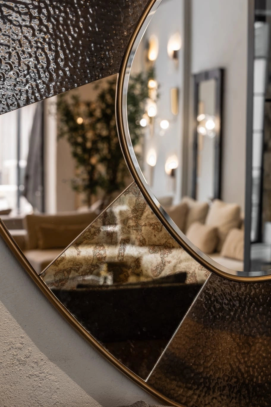 Info: it is an opulent masterpiece, a symphony of light and depth. This mirror is crafted from an exquisite blend of mirrored materials, each chosen to elevate its elegance. Clear, smoked,