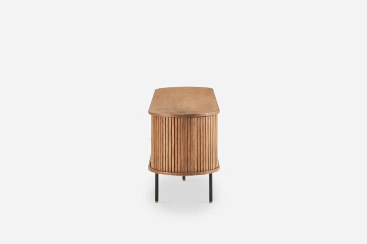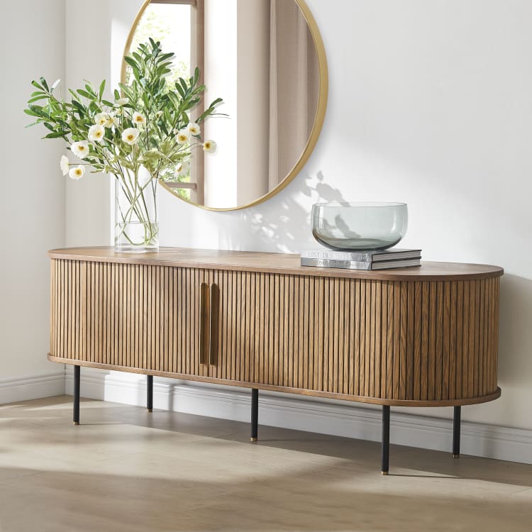 Info: A mid-century stunner, Shella’s oval silhouette and tamboured doors make this media console a must-have for the design-obsessed.